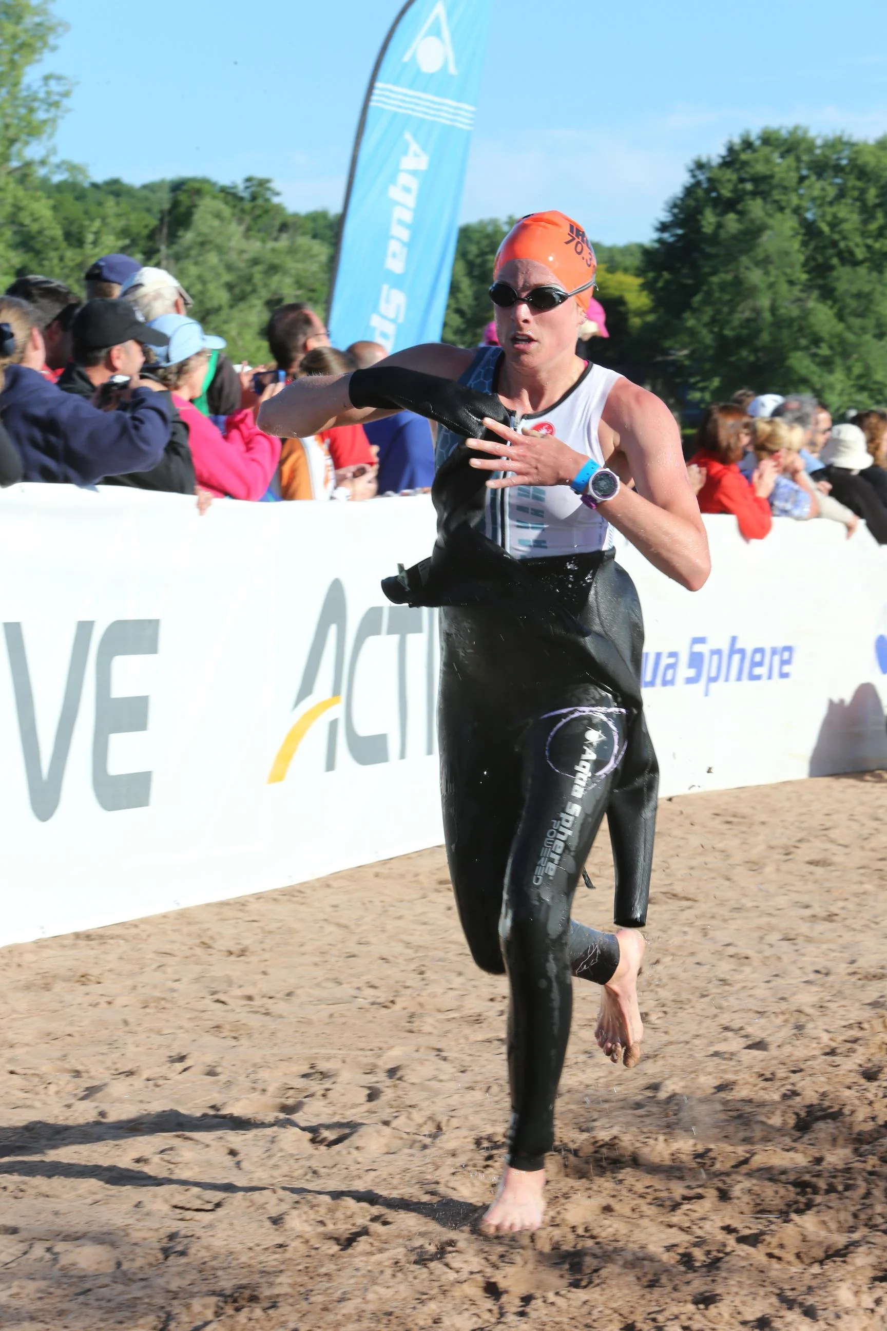 The swim was uneventful. I was happy that there was far less seaweed to swim through than last year. I tried to find some feet in the start, but inevidably ended up by myself. I still have not mastered an intense focus on swimming hard when I am swimming alone, and tend to zone out and think about how much I want to be on my bike, without taking the appropriate steps to make progress toward that wish. I finally made it out of the water, passing at least one female pro, distinguishable by the bright pink caps, in the last 200m.